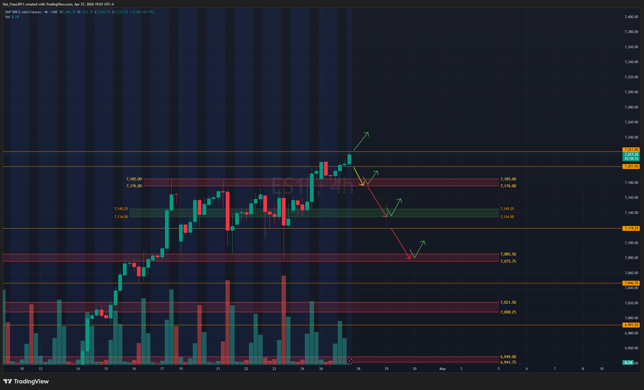 ES hôm nay lấy lại vị thế mạnh hơn một chút so với NQ, nhưng giá hiện chỉ đi sideway up nhẹ, không còn quá mạnh như mấy tuần trước, nên khả năng cao market đang chờ tin tức mới. Nếu ES rớt về vùng 7,176-7,185 và giữ được, đây có thể là vùng canh đánh lên lại vì ATH cũ đang chuyển thành hỗ trợ mới. Nếu rớt dưới 7,176, ES có thể đánh xuống vùng 7,134-7,145, nếu giữ được tại đây thì vẫn có thể đánh lên lại. Dưới 7,119 thì khả năng tiếp tục giảm sẽ cao hơn. Ngược lại, nếu breakout và hold trên 7,222, có thể canh đánh lên tiếp khi có momentum, nhưng bắt buộc phải có stop loss.