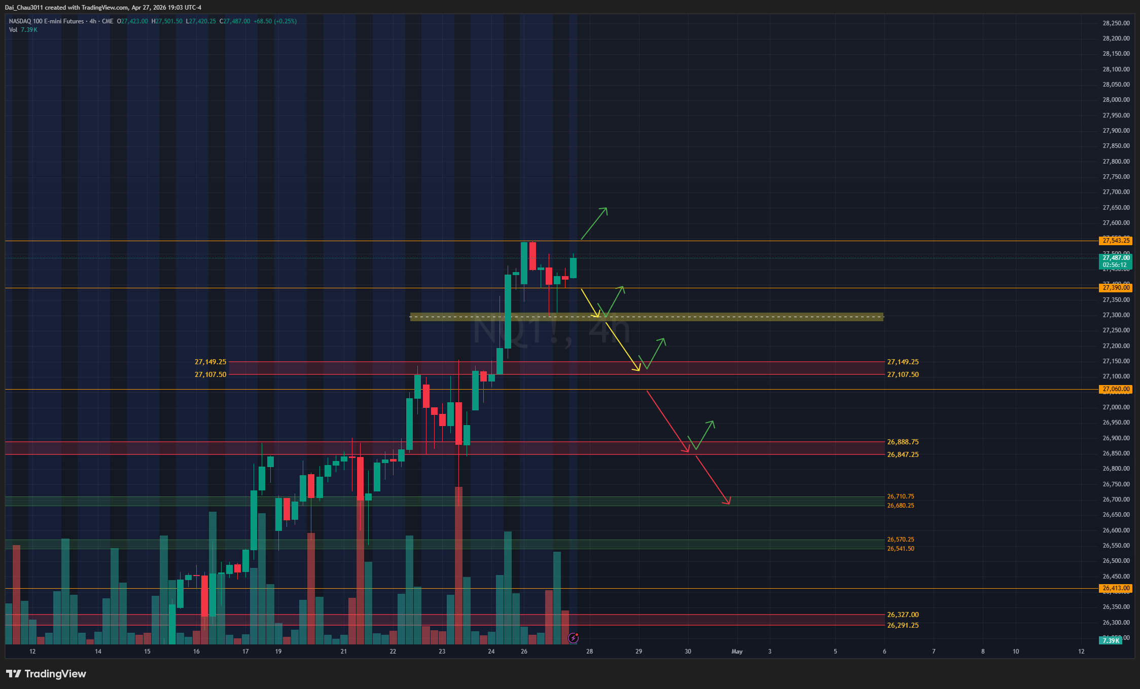 NQ hiện không mạnh bằng ES. Trong khi ES tạo higher high thì NQ lại tạo lower high, cho thấy đang có sự phân kỳ trên giá. Nếu NQ rớt về và giữ được vùng 27,275-27,310 thì mới nên canh đánh lên lại. Một kịch bản khác là đợi giá về backtest vùng polarity cũ 27,107-27,150, nếu giữ được thì có thể đánh lên tiếp. Nếu thủng dưới 27,060, NQ có thể đánh xuống lại, nhưng cần cẩn thận vì buyer vẫn còn mạnh; target là vùng 26,850-26,888. Nếu breakout và hold trên 27,543, có thể đánh lên tiếp nhưng nên đi size nhỏ và đặt stop loss cẩn thận.