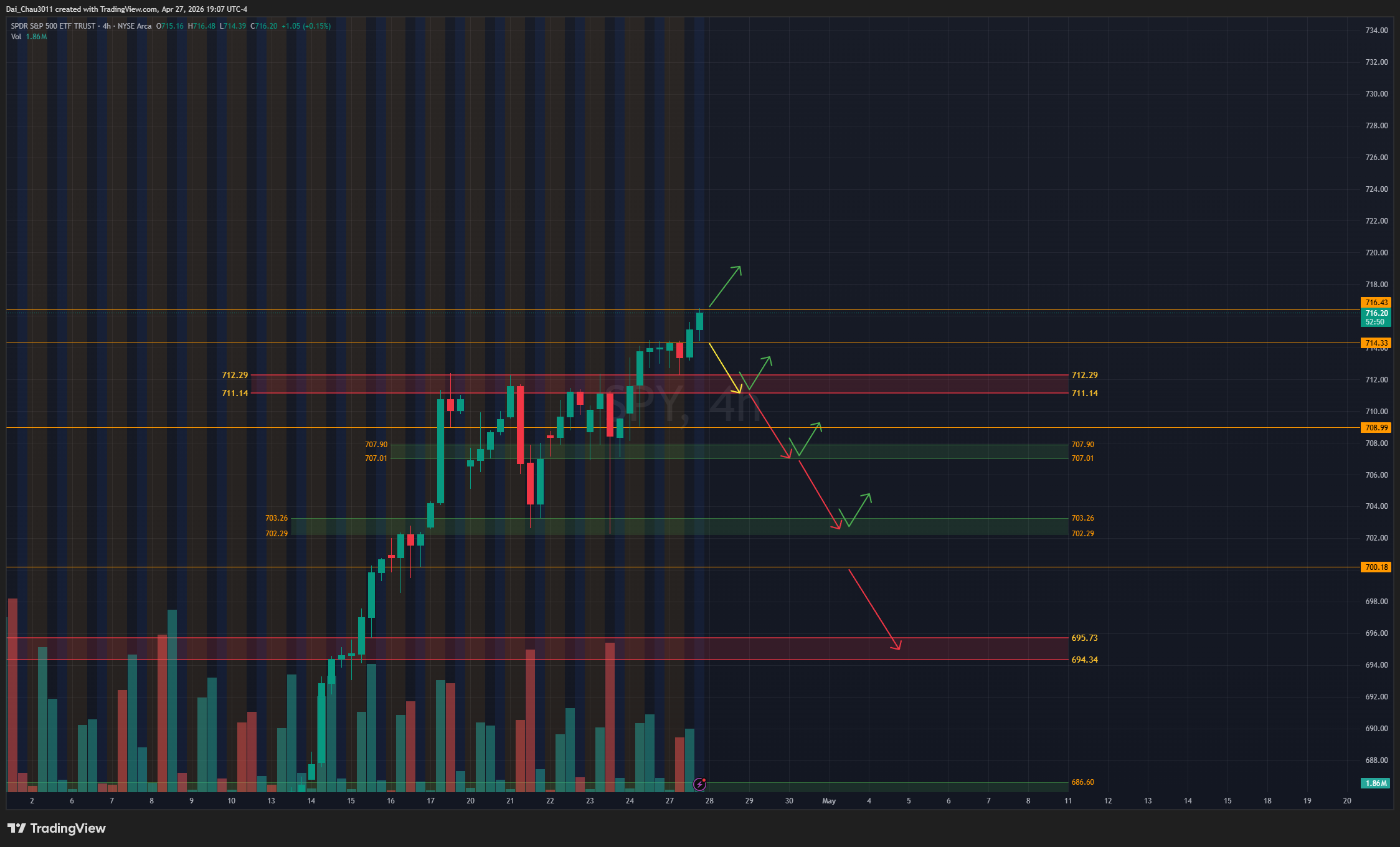 SPY giống ES, tiếp tục tạo high mới, tuy nhiên volume hiện tại khá thấp và có thể là thấp nhất trong cả tháng nay. Nếu SPY rớt về và giữ được vùng 711.5-712.3 thì có thể canh đánh lên lại. Nếu rớt dưới 711, SPY có thể đánh xuống để test lại vùng hỗ trợ 707-707.9; nếu giữ được vùng này thì vẫn có thể đánh lên lại. Dưới 707 thì khả năng giảm tiếp sẽ cao hơn. Nếu SPY tiếp tục break ATH 716.45, có thể canh momentum đánh lên, nhưng cần cẩn thận.