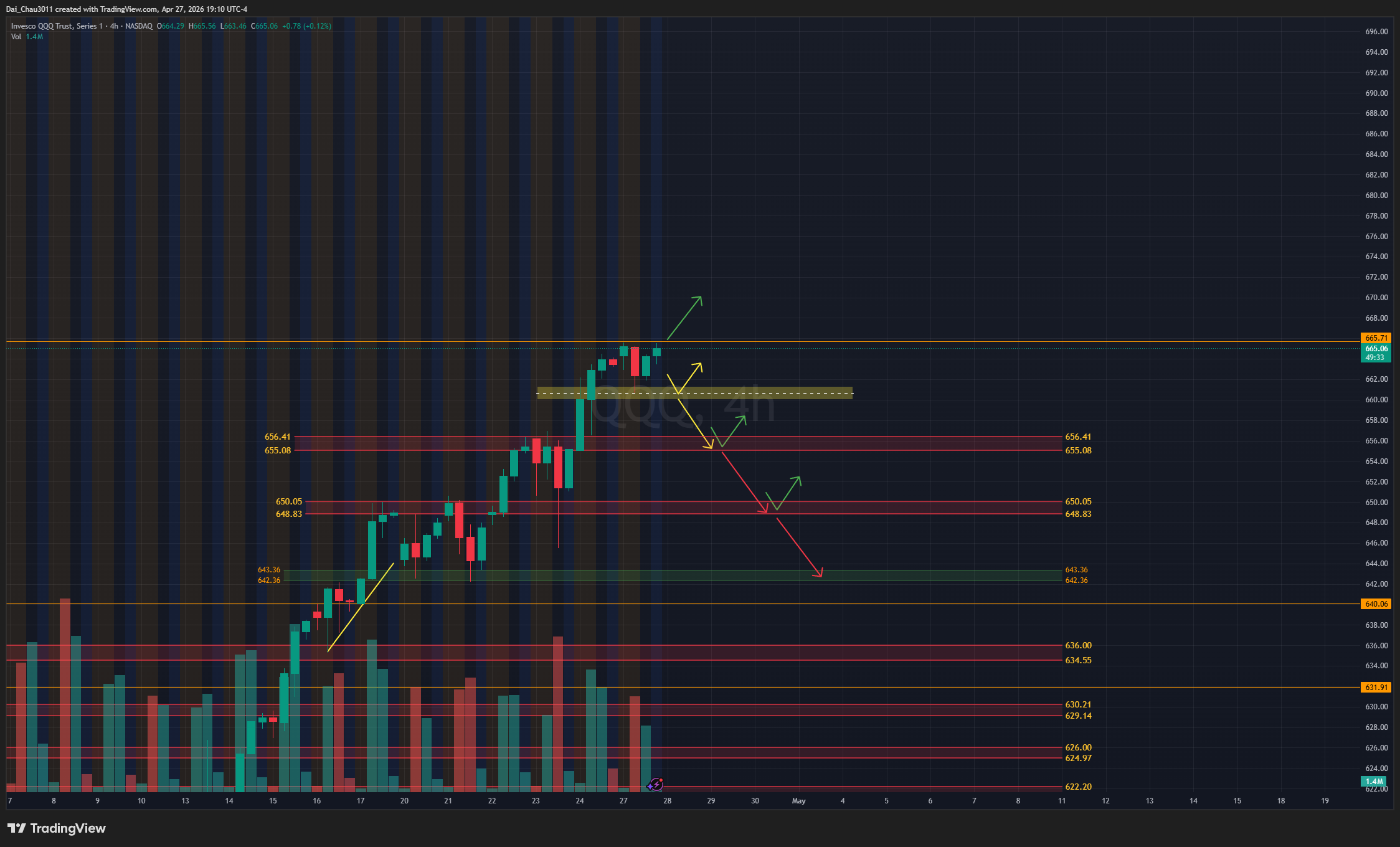 QQQ giống NQ, hiện đang tạo lower high. Nếu QQQ rớt xuống và giữ được vùng 660 thì có thể đánh lên tiếp. Nếu rớt dưới 660, giá có thể về test lại vùng hỗ trợ 655-656.4; nếu giữ được tại đây thì có thể đánh lên lại. Dưới 655 thì khả năng giảm tiếp sẽ cao hơn. Nếu break trên ATH 665.8, cần xem có momentum thật sự hay không rồi mới đánh lên tiếp, và vẫn phải cẩn thận.