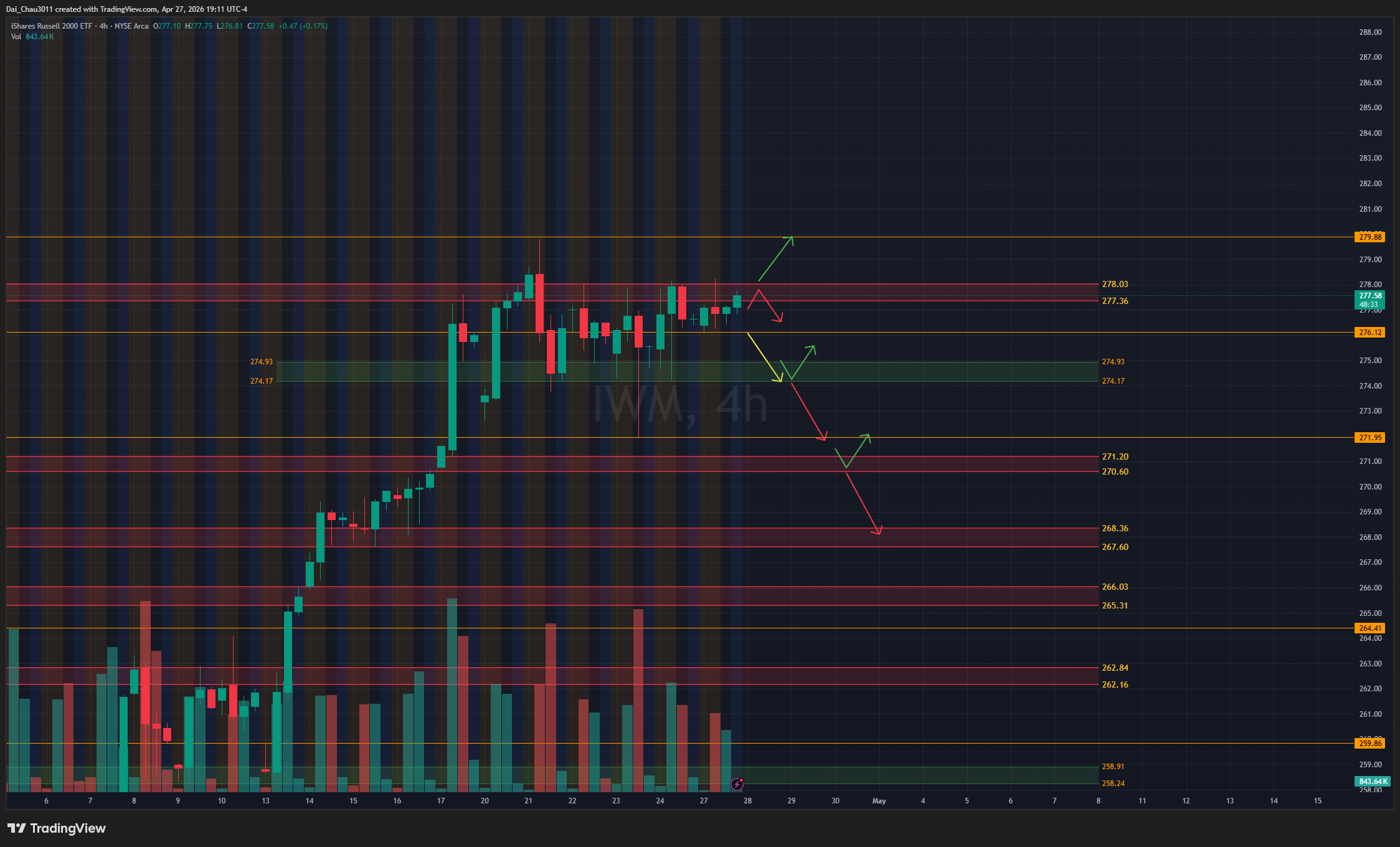 Khác với SPY và QQQ khi momentum vẫn còn đi lên nhẹ, IWM hiện vẫn đang đi sideway. Nếu IWM pullback và giữ được vùng 274.17-274.9 thì có thể đánh lên tiếp. Nếu rớt dưới 274 rồi backtest bị reject, giá có thể đánh xuống test lại vùng hỗ trợ 270.6-271.2; nếu giữ được vùng này thì có thể đánh lên lại. Dưới 270.6 thì khả năng giảm tiếp sẽ cao hơn. Nếu IWM lên lại vùng 277.36-278 nhưng bị reject, có thể canh đánh xuống lại. Nếu breakout và hold trên 278, target đầu tiên là 279.88.