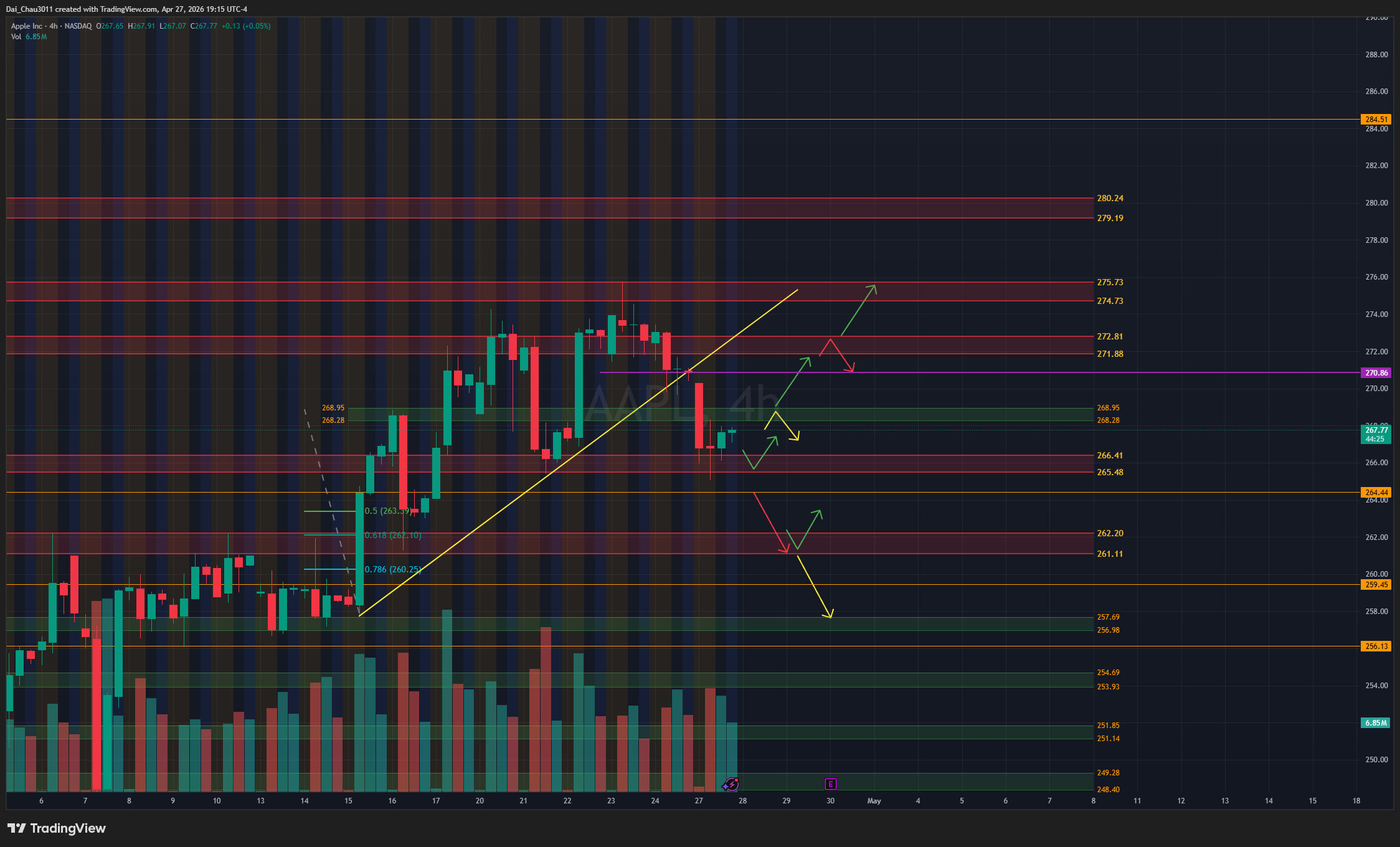 AAPL hiện đang biến động khá mạnh, ngày tăng ngày giảm nên cần cẩn thận. Nếu AAPL rớt về và giữ được vùng 265.5-266.4 thì mới nên canh đánh lên lại. Nếu rớt dưới 264.44, giá có thể đánh xuống lại vùng hỗ trợ 261.11-262.2; nếu giữ được tại đây thì có thể đánh lên lại. Dưới 261 thì khả năng giảm tiếp sẽ cao hơn. Nếu AAPL lên lại vùng 268.3-269 nhưng bị reject, có thể canh đánh xuống lại. Nếu breakout và hold trên 269, target đầu tiên là vùng kháng cự 271.88-272.8.