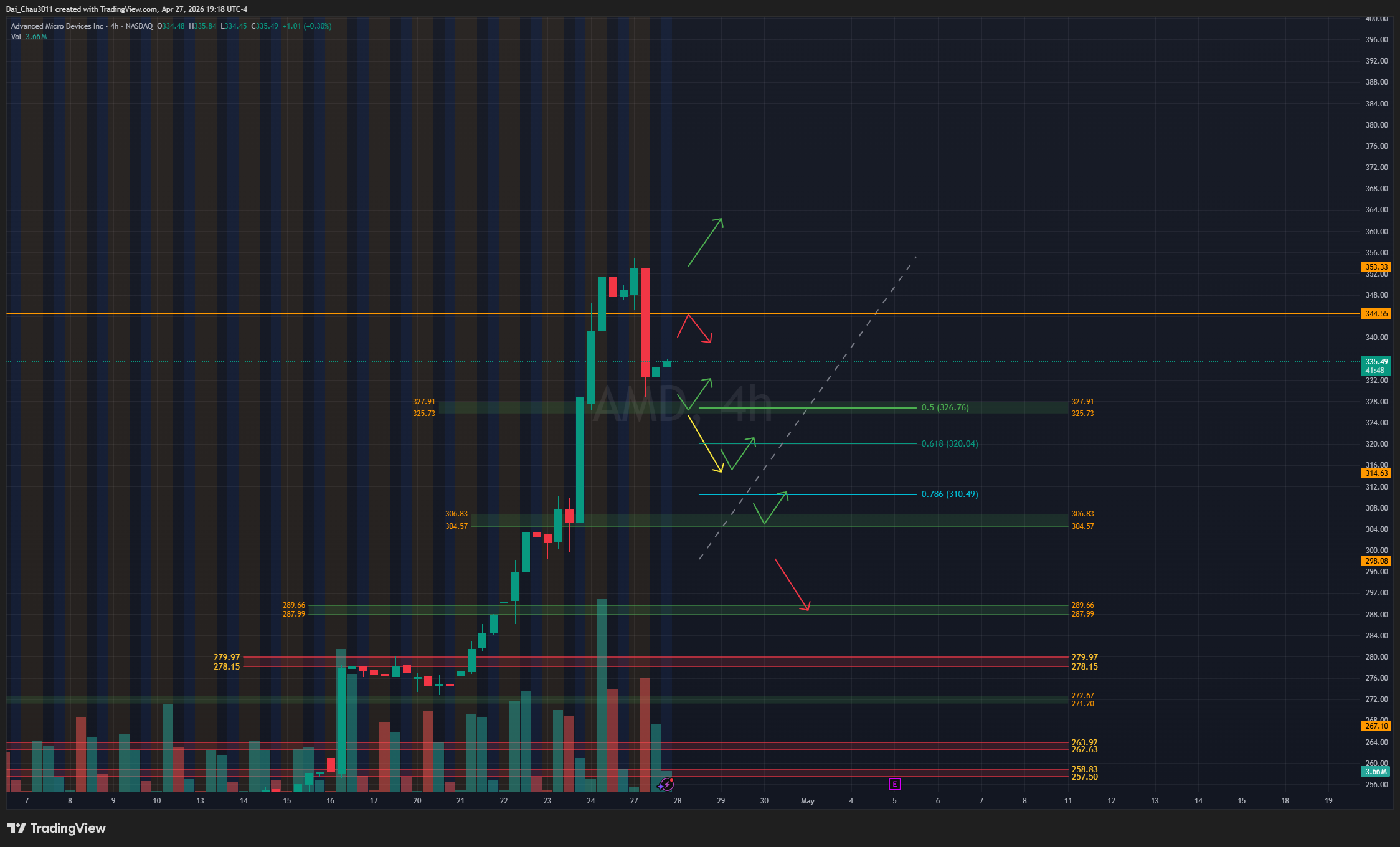 AMD sau chuỗi tăng mạnh thì hôm nay là ngày đầu tiên xuất hiện lực bán. Nếu AMD rớt về và giữ được vùng 325.73-327.9 thì có thể đánh lên lại. Nếu rớt dưới 325, có thể đợi giá test lại vùng hỗ trợ 304.6-306.8; nếu giữ được tại đây thì có thể đánh lên lại. Dưới 298 mới bắt đầu tìm điểm đánh xuống lại. Nếu AMD lên lại vùng 345-350 nhưng bị reject, có thể canh đánh xuống lại. Nếu break ATH, giá có thể đánh lên tiếp.