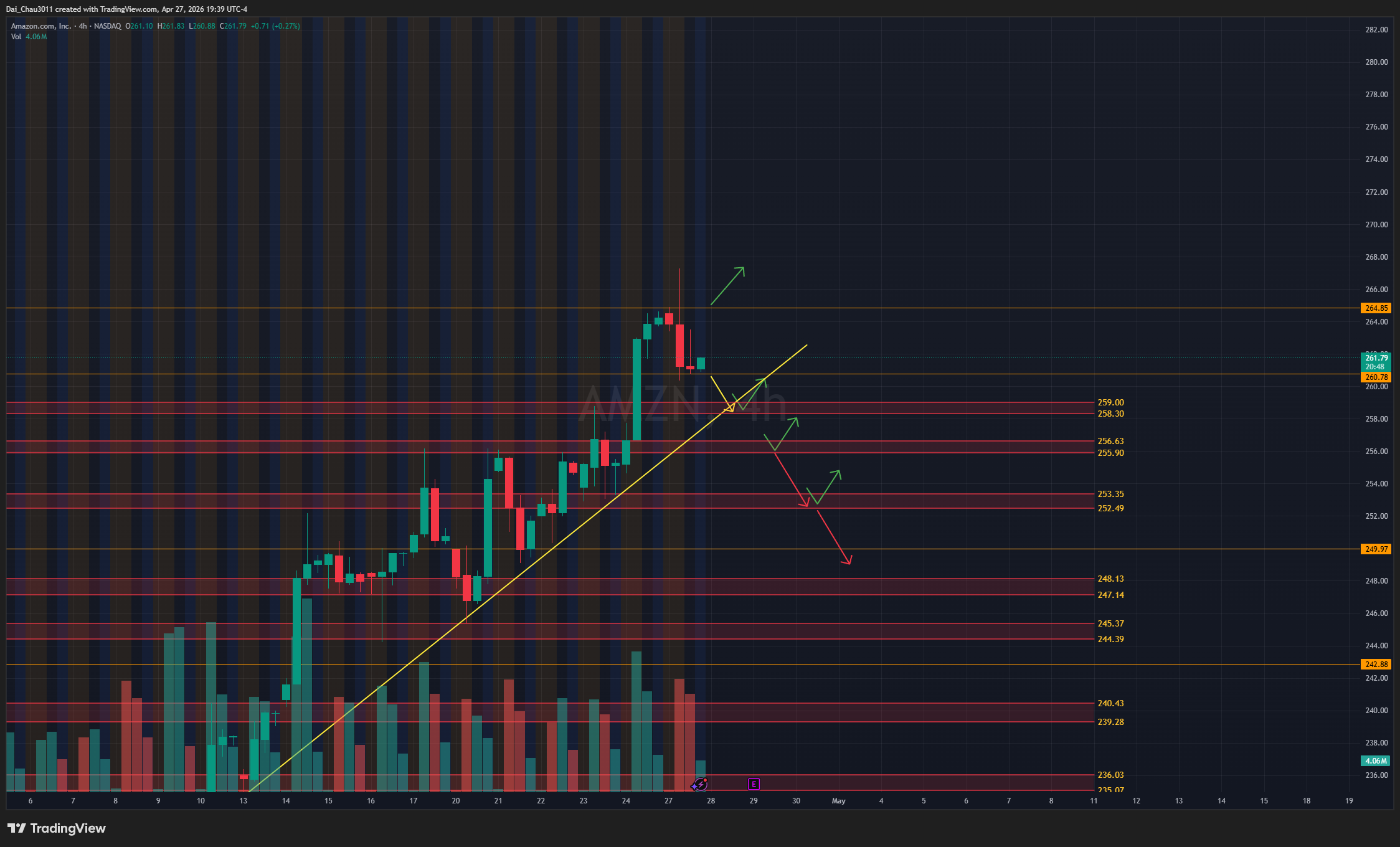 AMZN sau khi tạo ATH đã xuất hiện lực reject đầu tiên, đây có thể là nhịp chốt lời. Nếu rớt dưới 260.8, AMZN có thể đánh xuống test lại vùng hỗ trợ 258.3-259; nếu giữ được vùng này thì có thể đánh lên lại. Nếu rớt dưới 255.9, giá có thể tiếp tục giảm với target về vùng 252.5-253.4. Nếu breakout và hold trên ATH 264.85, AMZN có thể đánh lên tiếp nhưng vẫn cần cẩn thận.