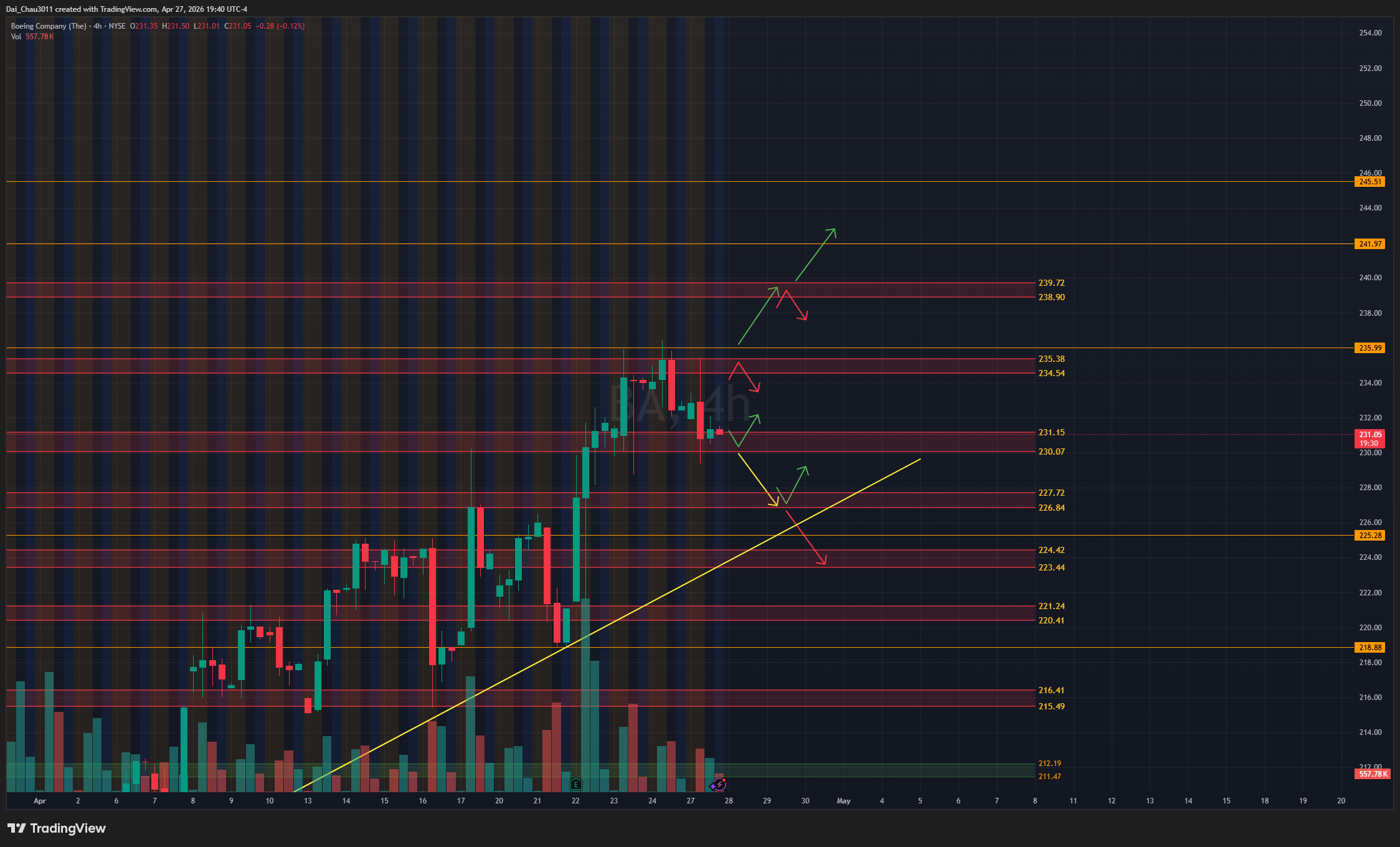 BA vẫn tiếp tục bị cản tại vùng 235, lực reject mới khá mạnh nhưng không có volume. Nếu BA giữ được vùng 230-231.15 thì mới nên canh đánh lên lại. Nếu rớt dưới 230, giá có thể đánh xuống target về vùng 226.84-227.72; nếu giữ được vùng này thì có thể đánh lên lại. Nếu BA lên lại vùng 235.4-235.54 nhưng bị reject mạnh, lúc đó mới có thể canh đánh xuống. Nếu break trên 236, giá có thể đánh lên test lại vùng kháng cự 238.9-239.7.