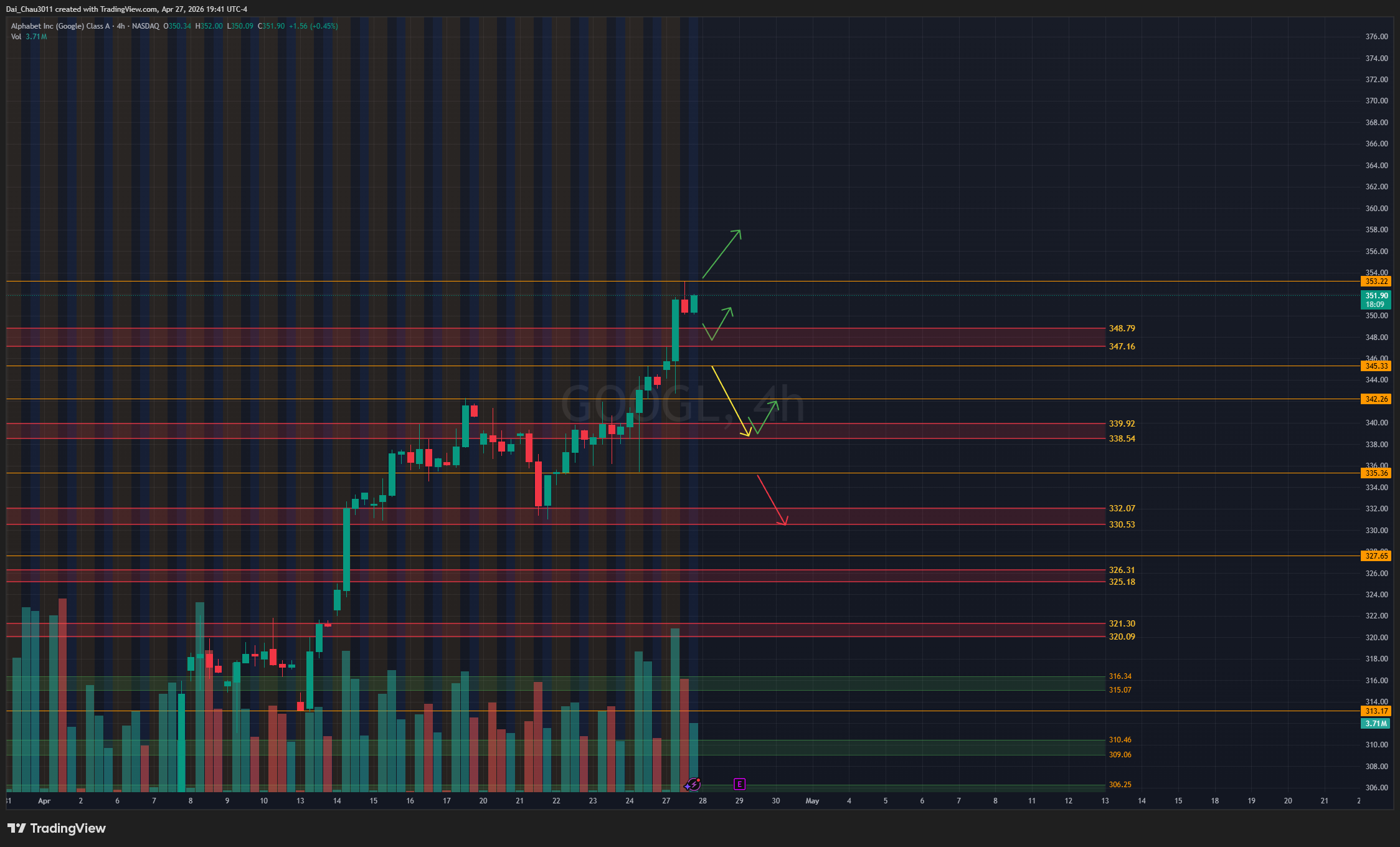 GOOGL chính thức tạo ATH mới, hiện cần quan sát xem có pullback để backtest lại đỉnh cũ rồi đi lên tiếp hay không. Nếu GOOGL giữ được vùng 347.16-348.8 thì mới nên canh đánh lên lại. Nếu rớt dưới 345.33, giá có thể đánh xuống target test lại vùng hỗ trợ 338.54-339.9. Nếu break trên ATH, GOOGL có thể đánh lên tiếp nhưng nên cẩn thận và đi size nhỏ.
