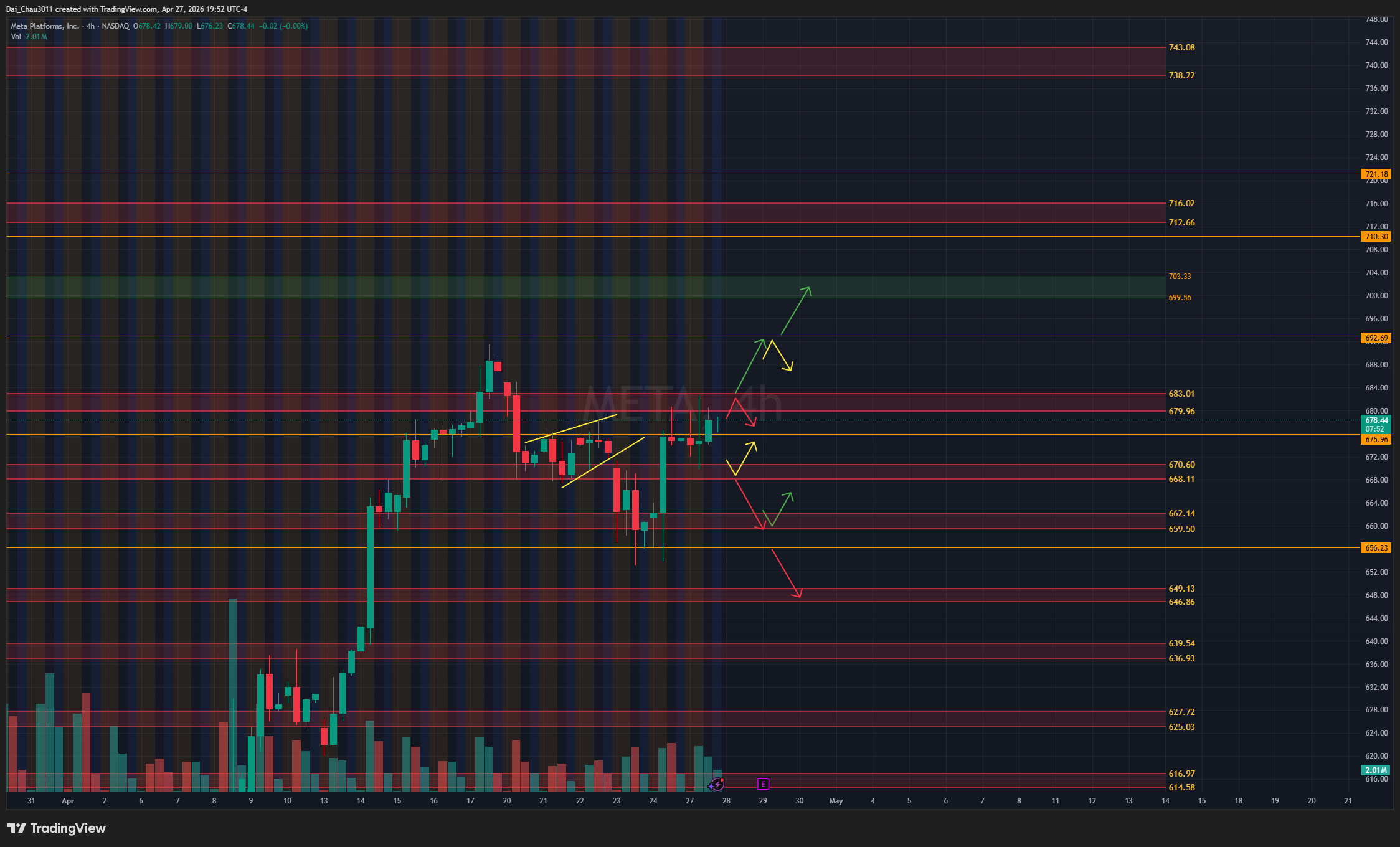 META vẫn chưa break được vùng 680-683. Nếu META về lại vùng 668-670.6 và giữ được thì mới nên canh đánh lên lại. Nếu rớt dưới 668, giá có thể đánh xuống tiếp về vùng 659.5-662.15; nếu giữ được vùng này thì có thể đánh lên tiếp. Dưới 656.23 thì có thể canh đánh xuống. Nếu META lên lại vùng 680-683 nhưng bị reject, có thể đánh xuống lại. Nếu breakout và hold trên 683, giá có thể đánh lên test level 692.7, sau đó test lại vùng kháng cự 699.56-703.33.