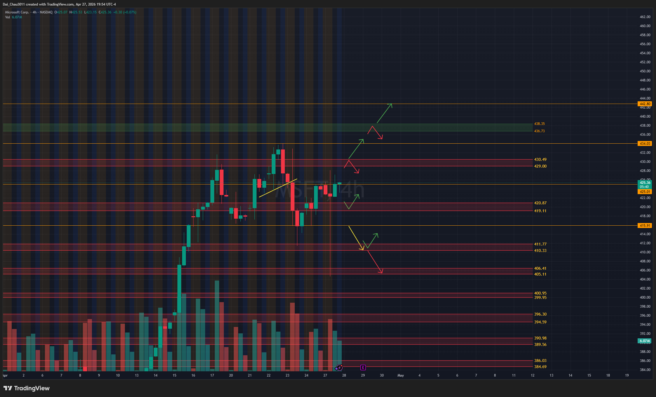 Pre-market sáng nay MSFT có một cây nến giật khá lạ, nhưng sau đó giá đã quay lại đi trong range. Nếu MSFT rớt về và giữ được vùng 419.11-420.87 thì có thể đánh lên tiếp. Nếu rớt dưới 415.9, giá có thể đánh xuống test lại vùng hỗ trợ 410.33-411.77; nếu giữ được thì mới canh đánh lên tiếp. Dưới 410 thì khả năng giảm tiếp sẽ cao hơn. Nếu MSFT lên lại vùng 429-430.5 nhưng bị reject mạnh thì mới nên đánh xuống. Nếu breakout và hold trên 430.5, giá có thể đánh lên test lại vùng kháng cự 436.73-438.35.
