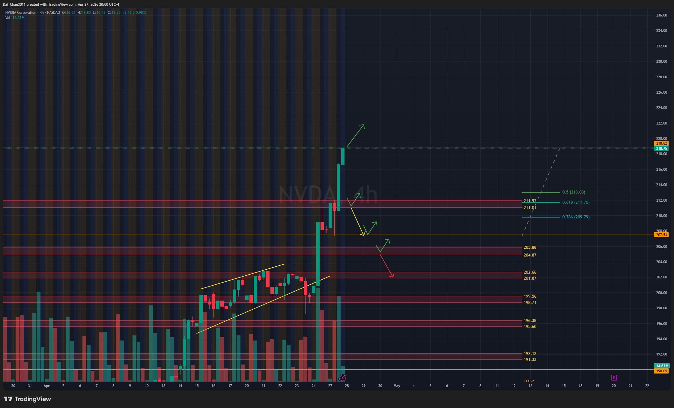 NVDA sáng nay rất mạnh, phá kháng cự và tạo ATH mới. Hiện tại nếu muốn đu theo thì nên đi size nhỏ, hoặc tốt hơn là đợi pullback rồi xem giá có giữ được hay không để đánh lên tiếp. Nếu NVDA rớt về và giữ được ATH cũ ở vùng 211-212 thì có thể đánh lên tiếp. Nếu rớt dưới 211, có thể thử đánh xuống với target đầu tiên là 207.5.