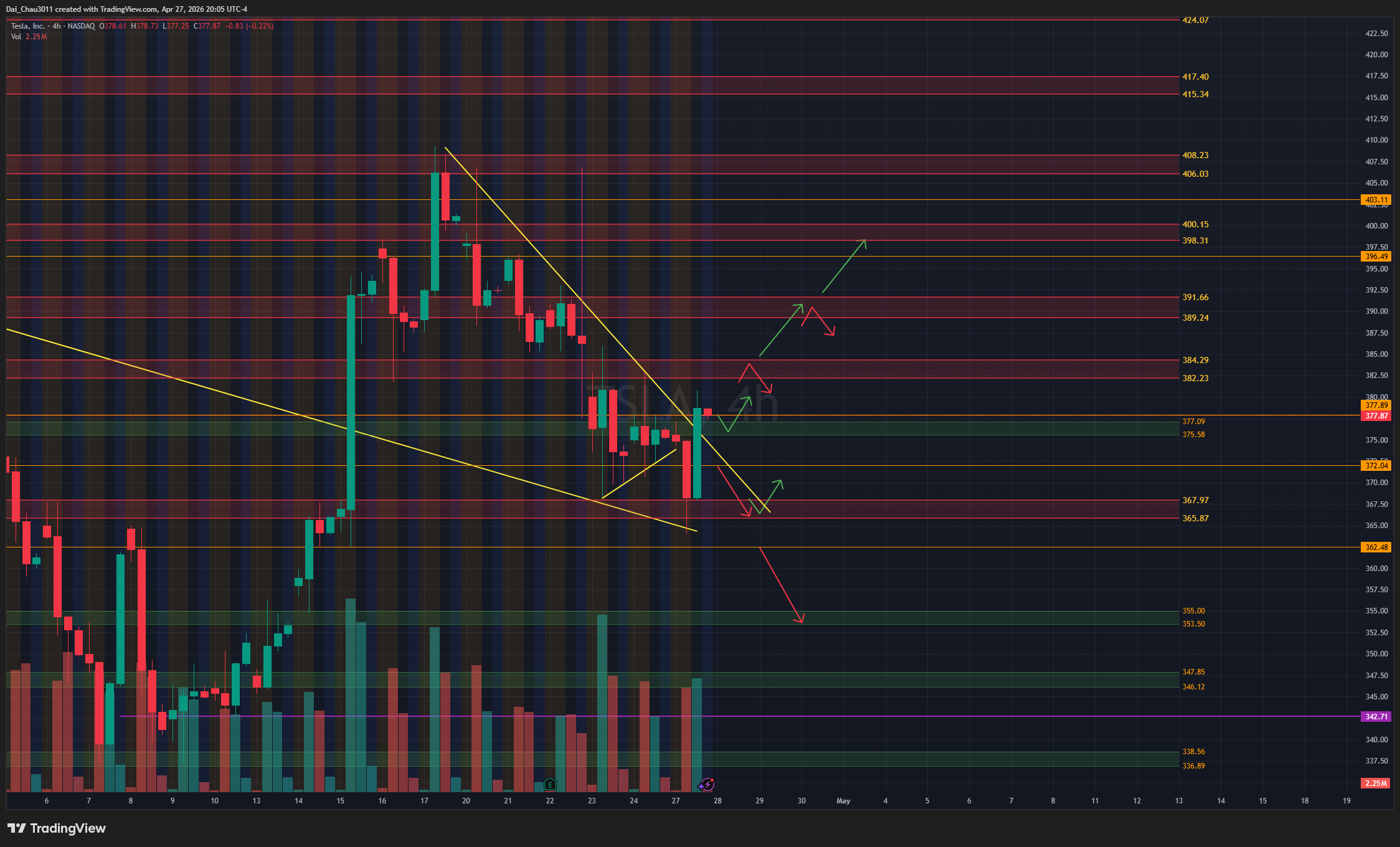 TSLA tuy vẫn đang trong downtrend, nhưng sáng nay đã có lực mua lên nhẹ. Nếu TSLA pullback về lại vùng 375.6-377 và giữ được thì mới nên canh đánh lên lại. Nếu rớt dưới 372, giá có thể đánh xuống test lại vùng hỗ trợ 365.9-368; nếu giữ được vùng này thì có thể đánh lên lại. Nếu TSLA lên lại vùng 382.25-384.3 nhưng bị reject, có thể canh đánh xuống lại. Nếu hold trên 384.3, giá có thể đánh lên test lại vùng kháng cự 389.25-391.66.