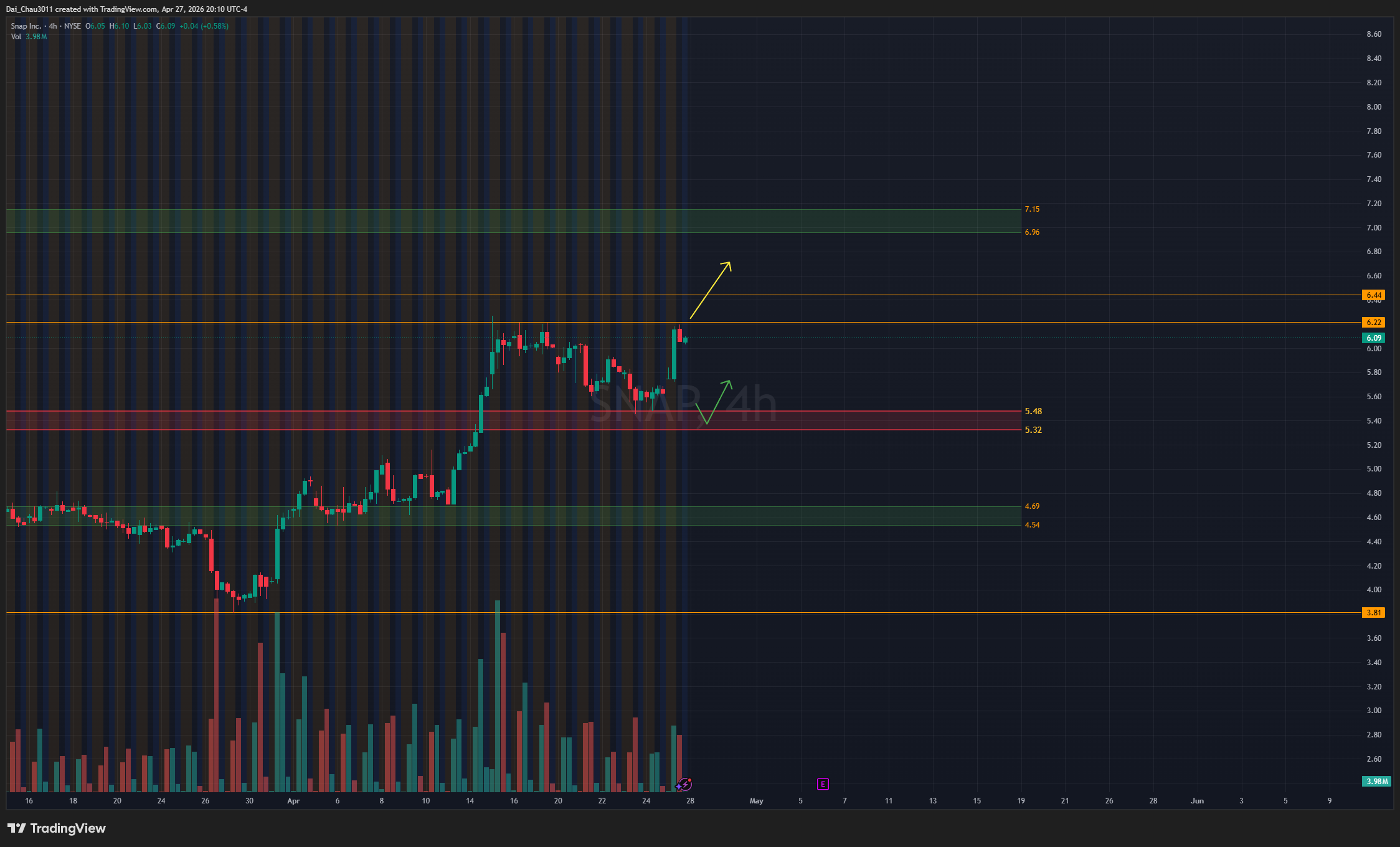 SNAP đang có momentum tăng. Nếu break trên 6.2, giá có thể đánh lên tiếp với target đầu tiên là 6.45, sau đó là vùng 7. Nếu pullback và giữ được vùng 5.3-5.5, SNAP có thể đánh lên tiếp, với stop loss dưới 4.5.