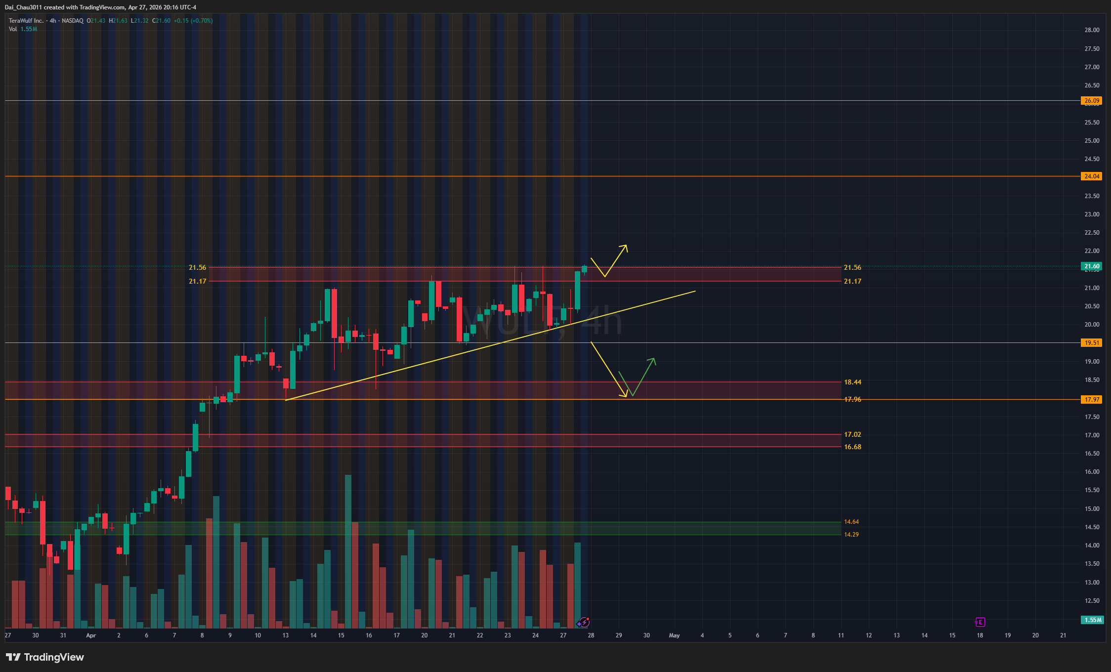 WULF đang có mô hình ascending triangle. Nếu breakout và hold trên 21, giá có thể đánh lên tiếp với target 24. Stop loss có thể đặt ngay dưới 19.5 hoặc 18, nhưng tỷ lệ risk reward hiện chỉ khoảng 1:1 nên cần cân nhắc kỹ.