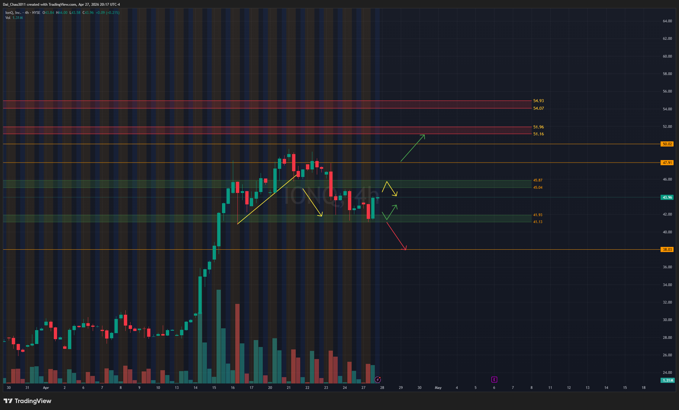 IONQ đang giữ được mô hình double bottom. Nếu vẫn hold trên 42, giá có thể đánh lên tiếp, với stop loss dưới 40. Nếu lên lại vùng 45-45.9 nhưng bị reject, có thể đánh xuống lại. Nếu hold trên 48, IONQ có thể đánh lên tiếp.