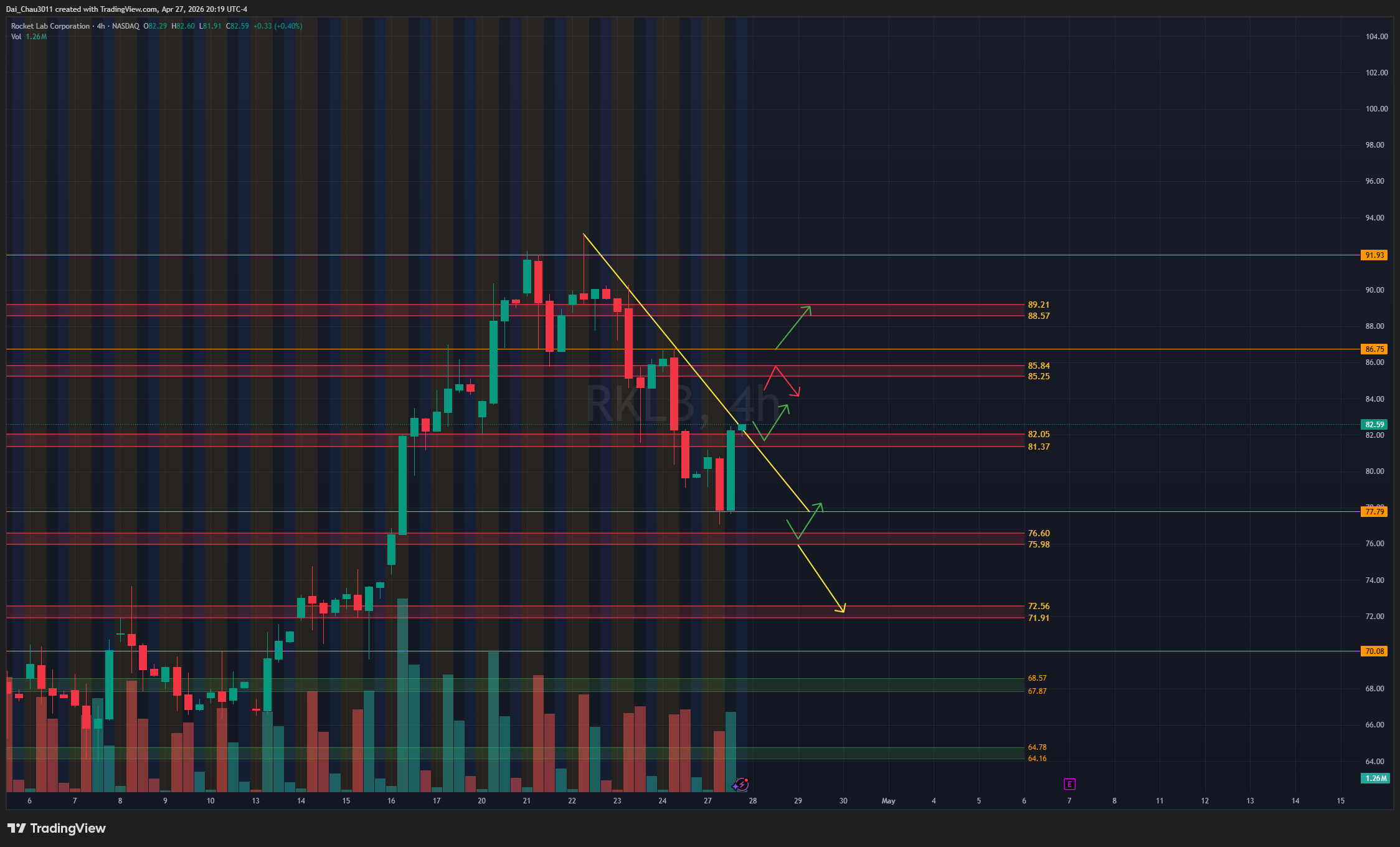RKLB tuy vẫn đang trong downtrend, nhưng đã break được kháng cự chéo. Nếu hold trên 82, giá có thể đánh lên tiếp, với stop loss ngay dưới 77.8. Nếu lên lại vùng 85 nhưng bị reject, có thể đánh xuống lại vì trend chính vẫn đang là downtrend. Nếu hold trên 86.75, RKLB có thể đánh lên tiếp.