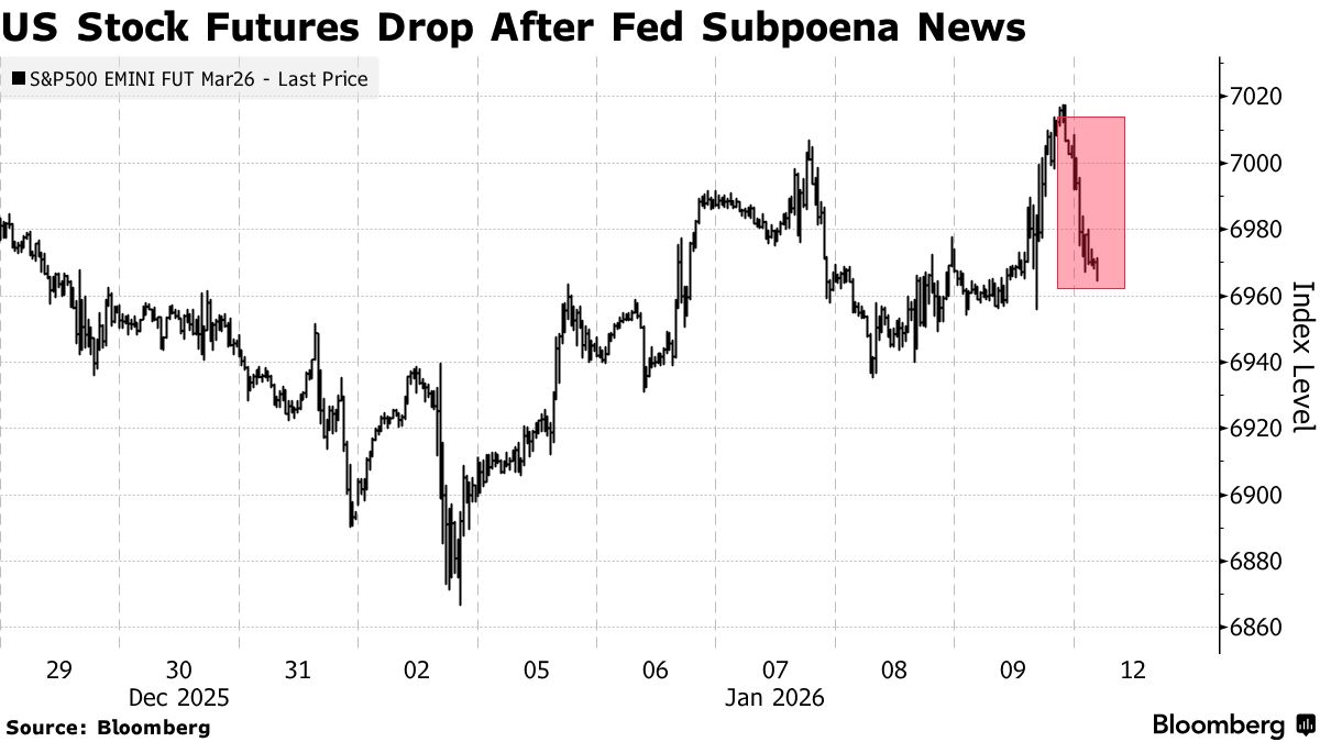 Hợp đồng tương lai chỉ số S&P 500 giảm 0,6%, trong khi Nasdaq 100 mất 0,8%, sau khi Chủ tịch Fed Jerome Powell xác nhận Fed nhận trát triệu tập liên quan đến cải tạo trụ sở. Lợi suất trái phiếu dài hạn tăng mạnh, trong khi đồng đô la ghi nhận mức giảm mạnh nhất kể từ kỳ nghỉ Giáng sinh.