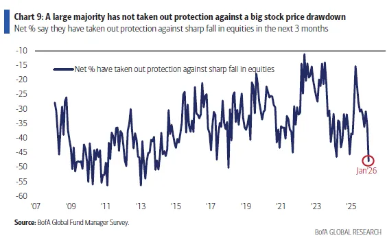 Chỉ báo Bull & Bear của BofA đã chuyển sang trạng thái “siêu lạc quan”, một tín hiệu thường đi kèm với rủi ro điều chỉnh gia tăng. Tuy nhiên, thay vì tăng cường phòng vệ, gần một nửa số nhà đầu tư được khảo sát cho biết họ không áp dụng bất kỳ biện pháp bảo vệ nào trước khả năng cổ phiếu giảm mạnh — tỷ lệ cao nhất kể từ năm 2018.