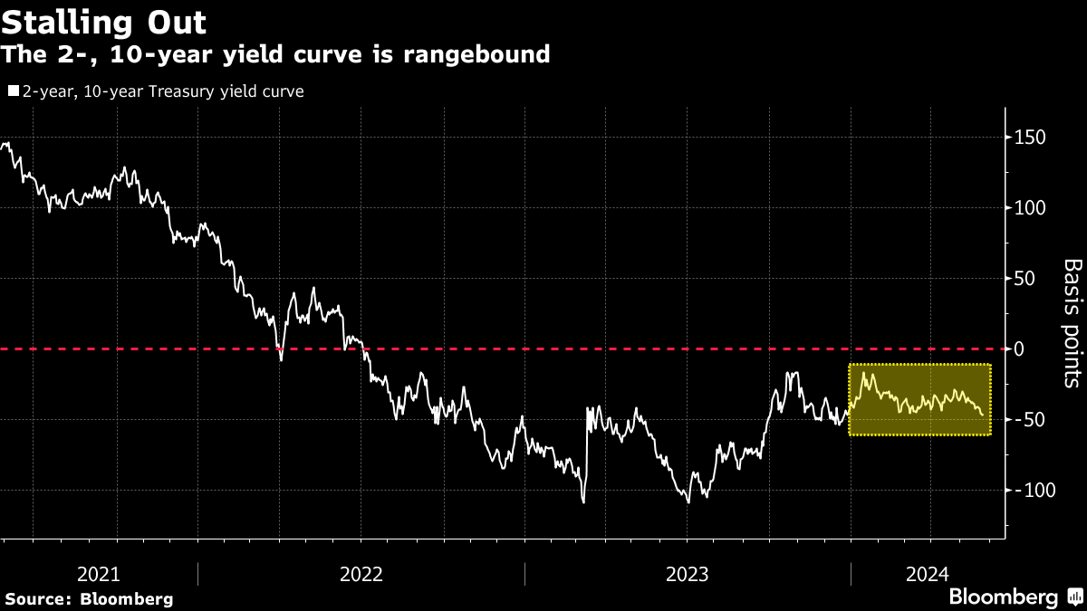 Chênh lệch lợi suất trái phiếu kỳ hạn 2 và 10 năm đã giảm xuống -46 điểm cơ bản, gần mức đảo ngược nhất trong năm. Mặc dù có kỳ vọng rằng đường cong sẽ bình thường hóa trong năm nay do dự đoán về chu kỳ cắt giảm lãi suất của Cục Dự trữ Liên bang, nhưng thực tế lại không như vậy.