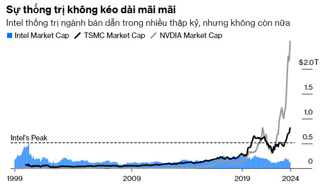 Nvidia đang dẫn đầu trong công nghệ AI, với mức tăng trưởng doanh thu ấn tượng. Tuy nhiên, sự thống trị này không đảm bảo rằng giá cổ phiếu sẽ tiếp tục tăng mãi mãi. Lịch sử đã chứng minh rằng các công ty công nghệ có thể mất đi vị thế dẫn đầu khi đối mặt với sự cạnh tranh và những thay đổi trong công nghệ. So sánh với Intel, một gã khổng lồ trong ngành bán dẫn, cho thấy rằng ngay cả những công ty hàng đầu cũng có thể phải đối mặt với những thách thức lớn trong tương lai.