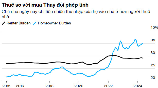 Nguồn: Zillow Group Inc. Lưu ý: Gánh nặng của chủ sở hữu nhà là phần thu nhập chi cho chi phí nhà ở bao gồm thế chấp, thuế tài sản và bảo hiểm chủ sở hữu nhà đối với một ngôi nhà điển hình ở Hoa Kỳ. Gánh nặng tiền thuê là phần thu nhập chi theo giá thị trường để yêu cầu tiền thuê của một căn hộ điển hình.