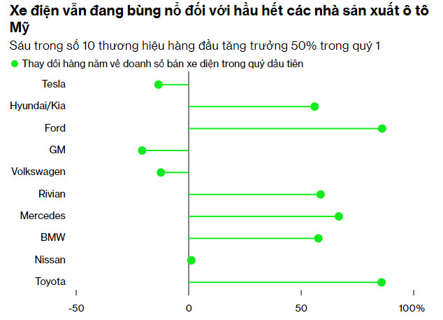 Tuy nhiên, khi nhìn sâu hơn, chúng ta thấy rằng hầu hết các nhà sản xuất xe điện lớn tại Mỹ vẫn đang chứng kiến mức tăng trưởng doanh số đáng kể. Trong quý đầu tiên, sáu trong số mười nhà sản xuất xe điện hàng đầu tại Mỹ đã tăng trưởng từ 56% đến 86% so với cùng kỳ năm trước. Điều này cho thấy thị trường xe điện vẫn đang bùng nổ đối với nhiều thương hiệu.