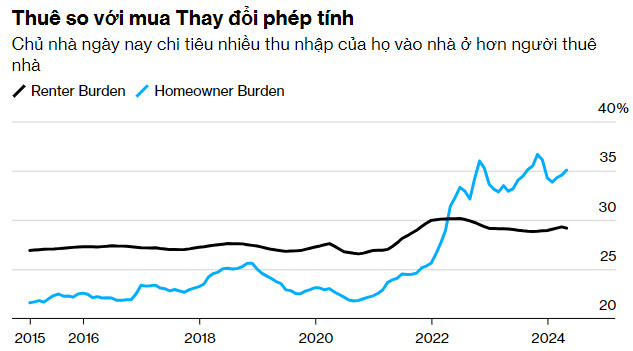 Lưu ý: Gánh nặng của chủ sở hữu nhà là phần thu nhập chi cho chi phí nhà ở bao gồm thế chấp, thuế tài sản và bảo hiểm chủ sở hữu nhà đối với một ngôi nhà điển hình ở Hoa Kỳ. Gánh nặng tiền thuê là phần thu nhập chi theo giá thị trường để yêu cầu tiền thuê của một căn hộ điển hình.