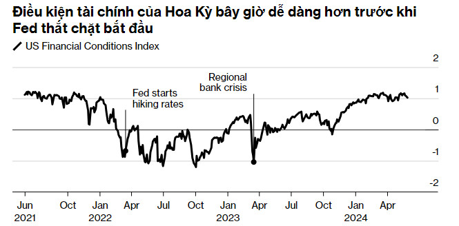 Điều kiện tài chính tại Hoa Kỳ hiện nay đang dễ dàng hơn so với trước khi Fed bắt đầu thắt chặt lãi suất. Chỉ số điều kiện tài chính của Bloomberg cho thấy thị trường chứng khoán đã tăng vọt, đưa các chỉ số lên mức cao kỷ lục. Sự phục hồi của trái phiếu doanh nghiệp đã làm giảm phí bảo hiểm xuống mức thấp lịch sử, tạo điều kiện thuận lợi cho các nhà đầu tư.
