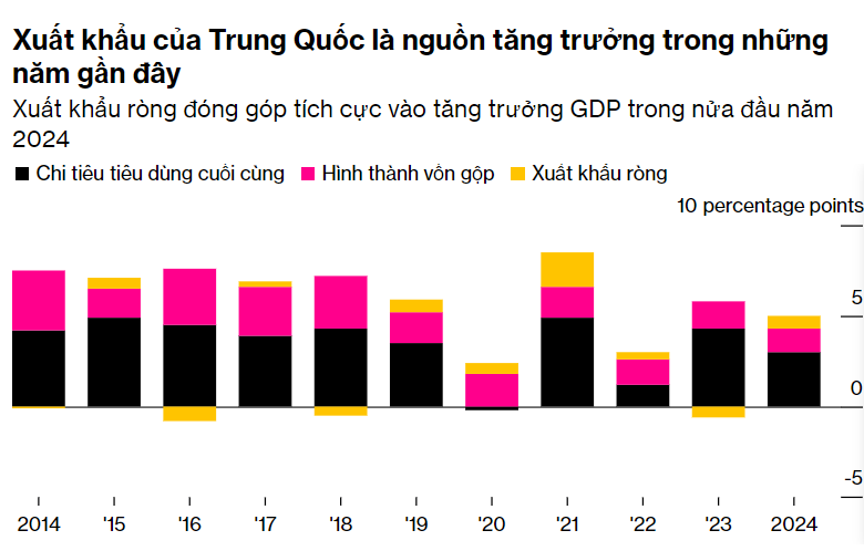 Nguồn: Cục Thống kê Quốc gia Lưu ý: Số liệu năm 2024 thể hiện nửa đầu năm. Số liệu thể hiện mức đóng góp vào tăng trưởng GDP theo phần trăm.