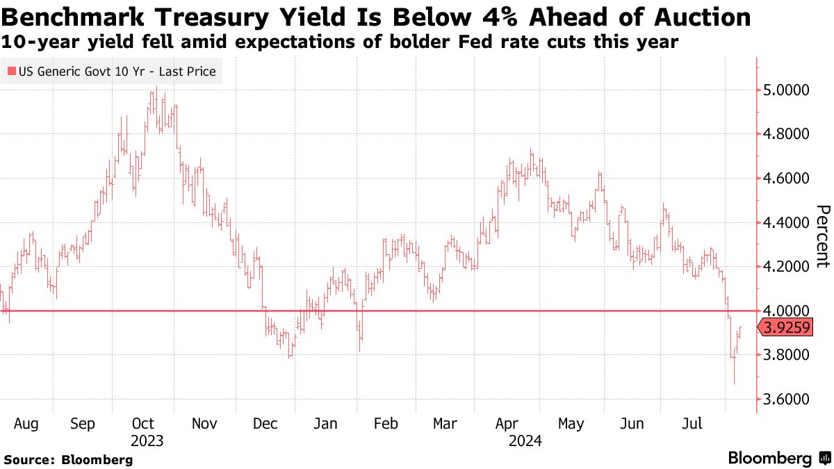 Hoa Kỳ đang chuẩn bị bán trái phiếu kho bạc kỳ hạn 10 năm với mức lợi suất dưới 4% lần đầu tiên trong một năm. Đợt tăng giá trái phiếu gần đây là do kỳ vọng về việc Cục Dự trữ Liên bang (Fed) sẽ cắt giảm lãi suất nhanh chóng và mạnh mẽ.