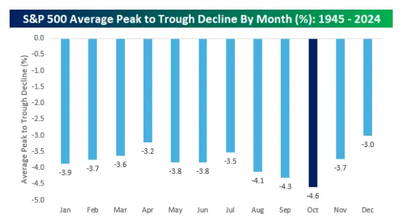 Theo dữ liệu từ Bespoke Investment Group, tháng 10 là một tháng thường có nhiều biến động đối với thị trường cổ phiếu, nhưng cũng là thời điểm tốt cho các nhà đầu tư có tầm nhìn dài hạn. Tuy nhiên, mức giảm trung bình trong tháng này từ đỉnh xuống đáy là 4,6%, cao hơn nhiều so với các tháng khác trong năm.