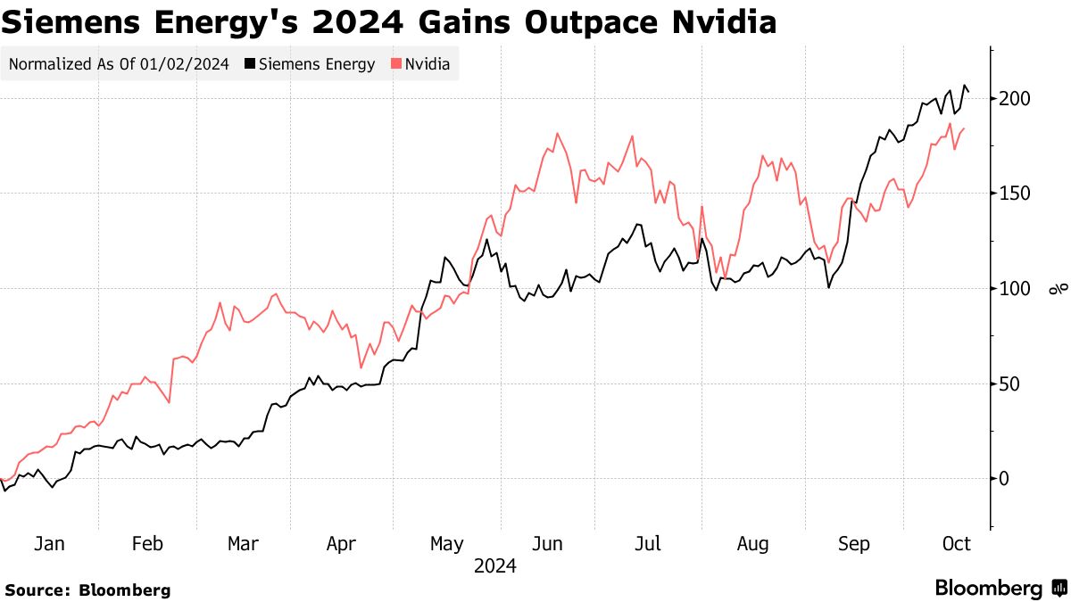 Trong năm nay, cổ phiếu của Siemens Energy AG đã tăng trưởng ấn tượng, gấp ba lần giá trị, vượt qua mức tăng 177% của Nvidia Corp. Đây là thành quả đáng kinh ngạc trong bối cảnh các cổ phiếu châu Âu nhìn chung hoạt động kém hơn so với các đối thủ Mỹ.