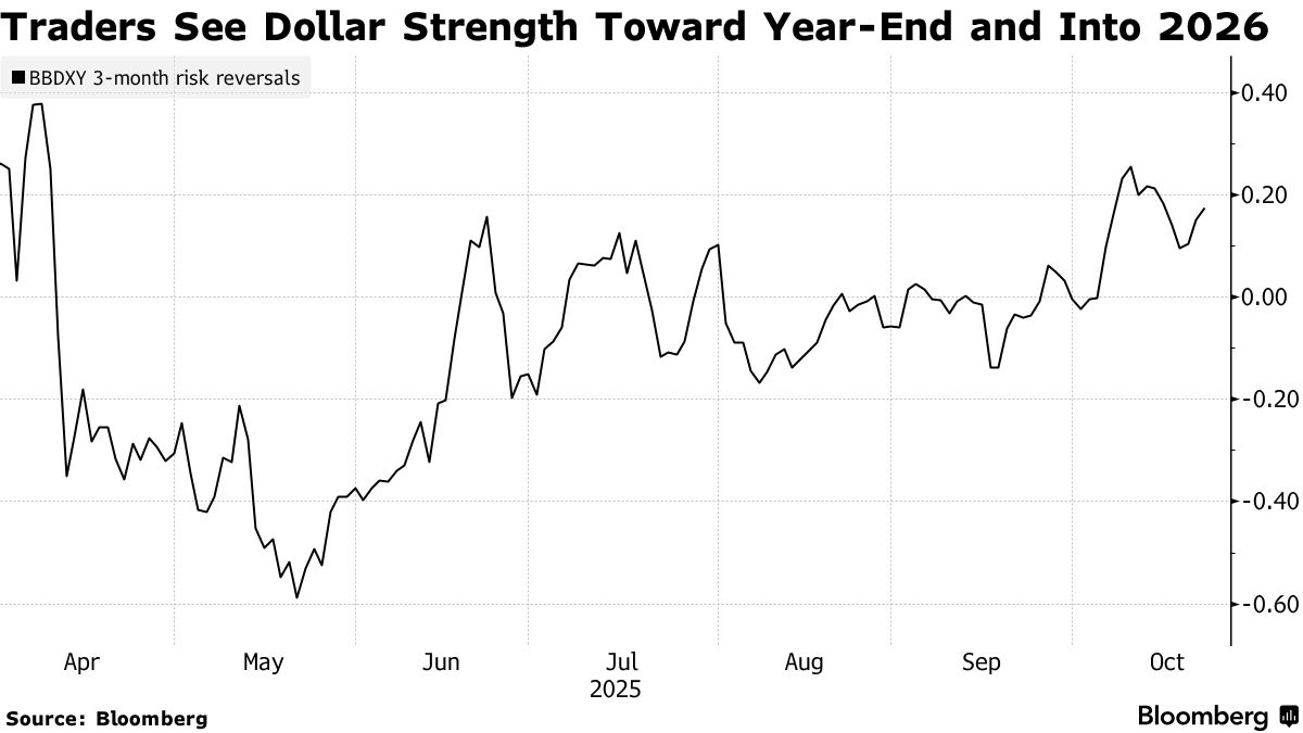 Chỉ số 3-month risk reversal của Bloomberg Dollar Spot Index cho thấy ưu thế nghiêng về quyền chọn mua (call options), thể hiện kỳ vọng đồng đô la mạnh hơn trong quý tới.