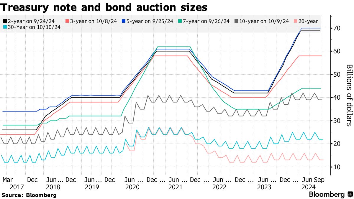 Bộ Tài chính Hoa Kỳ đã duy trì hướng dẫn giữ nguyên quy mô đấu giá trong vài quý gần đây, đặc biệt là đối với các trái phiếu dài hạn như trái phiếu kỳ hạn 10 năm (chứng khoán Mỹ). Tuy nhiên, với thâm hụt ngày càng lớn, các chuyên gia đang đặt câu hỏi liệu điều này có thể kéo dài bao lâu. Khi thị trường trái phiếu trở nên biến động với lợi suất tăng, bất kỳ gợi ý nào về việc tăng quy mô đấu giá đều có thể gây ra biến động.