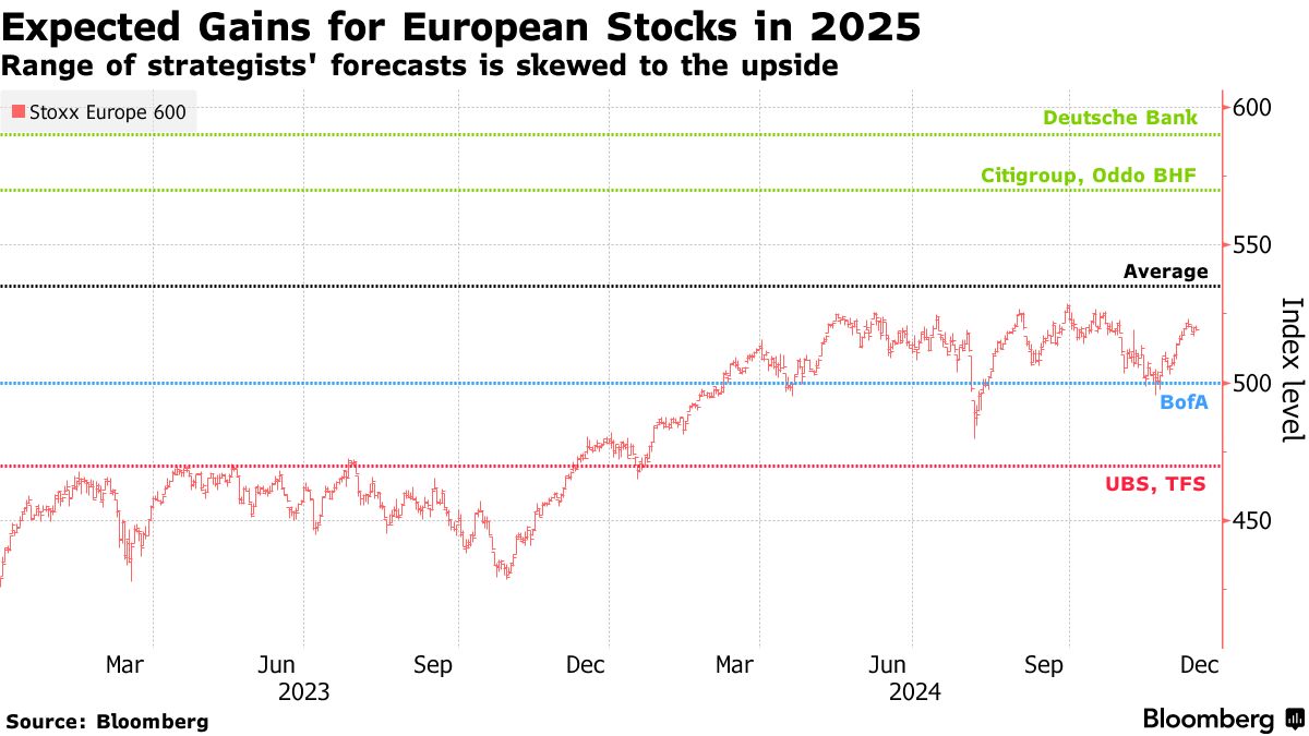 Dự báo của một số chuyên gia như TFS Derivatives và UBS cho thấy Stoxx 600 có thể giảm tới 10%, với mức dự báo xuống còn 470 điểm. Họ chỉ ra rằng yếu tố chính đến từ sự suy yếu của kinh tế Trung Quốc, tăng trưởng yếu của Mỹ và áp lực từ các chính sách thương mại của Donald Trump có thể tiếp tục tác động tiêu cực đến cổ phiếu châu Âu.